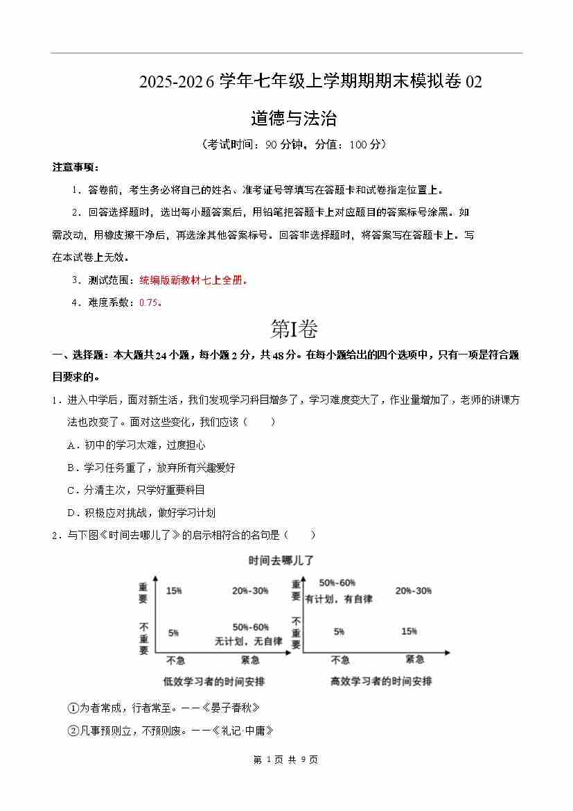 七年级道德与法治上学期期末模拟卷02(统编版新教材)(考试版A4)