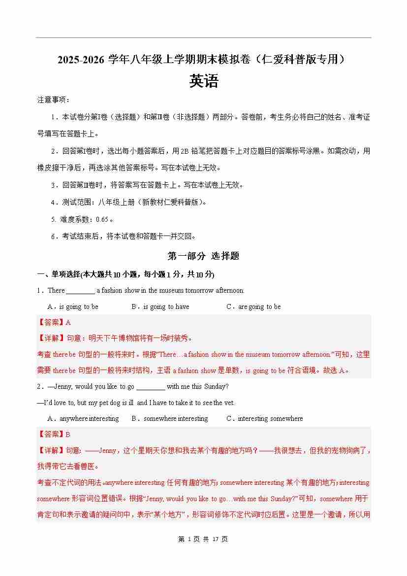 八年级英语仁爱版上学期期末模拟卷(仁爱科普版专用)(解析版)