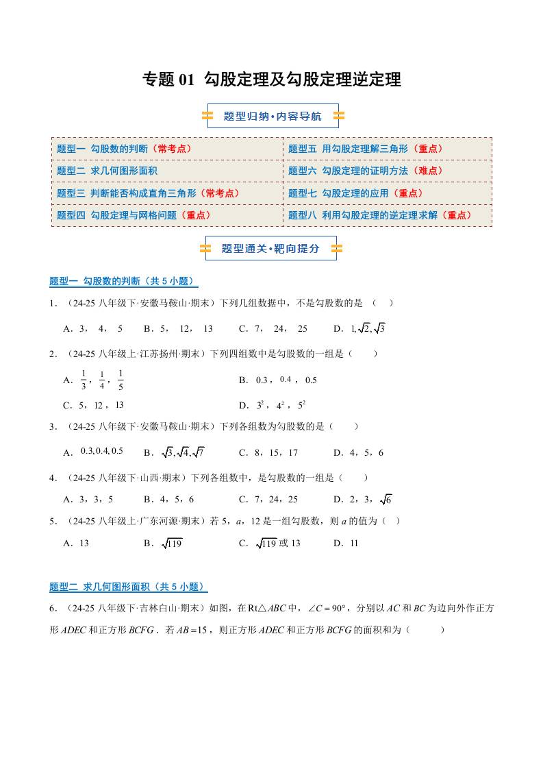 专题01 勾股定理及勾股定理逆定理(8大题型)(期末复习专项训练)(原卷版)