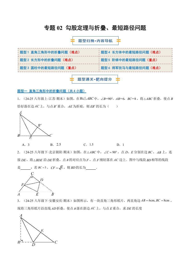 专题02 勾股定理与折叠、最短路径问题(6大题型)(期末复习专项训练)(原卷版)