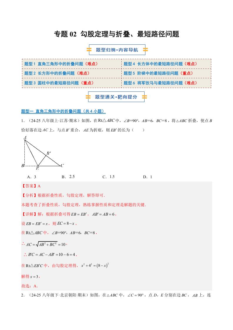 专题02 勾股定理与折叠、最短路径问题(6大题型)(期末复习专项训练)(解析版)