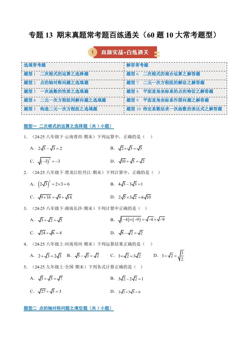 专题13 期末真题常考题百练通关(期末复习专项训练)(原卷版)