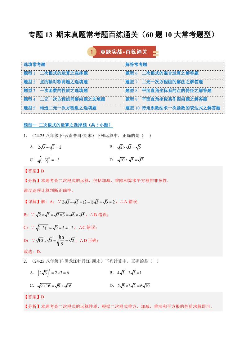 专题13 期末真题常考题百练通关(期末复习专项训练)(解析版)