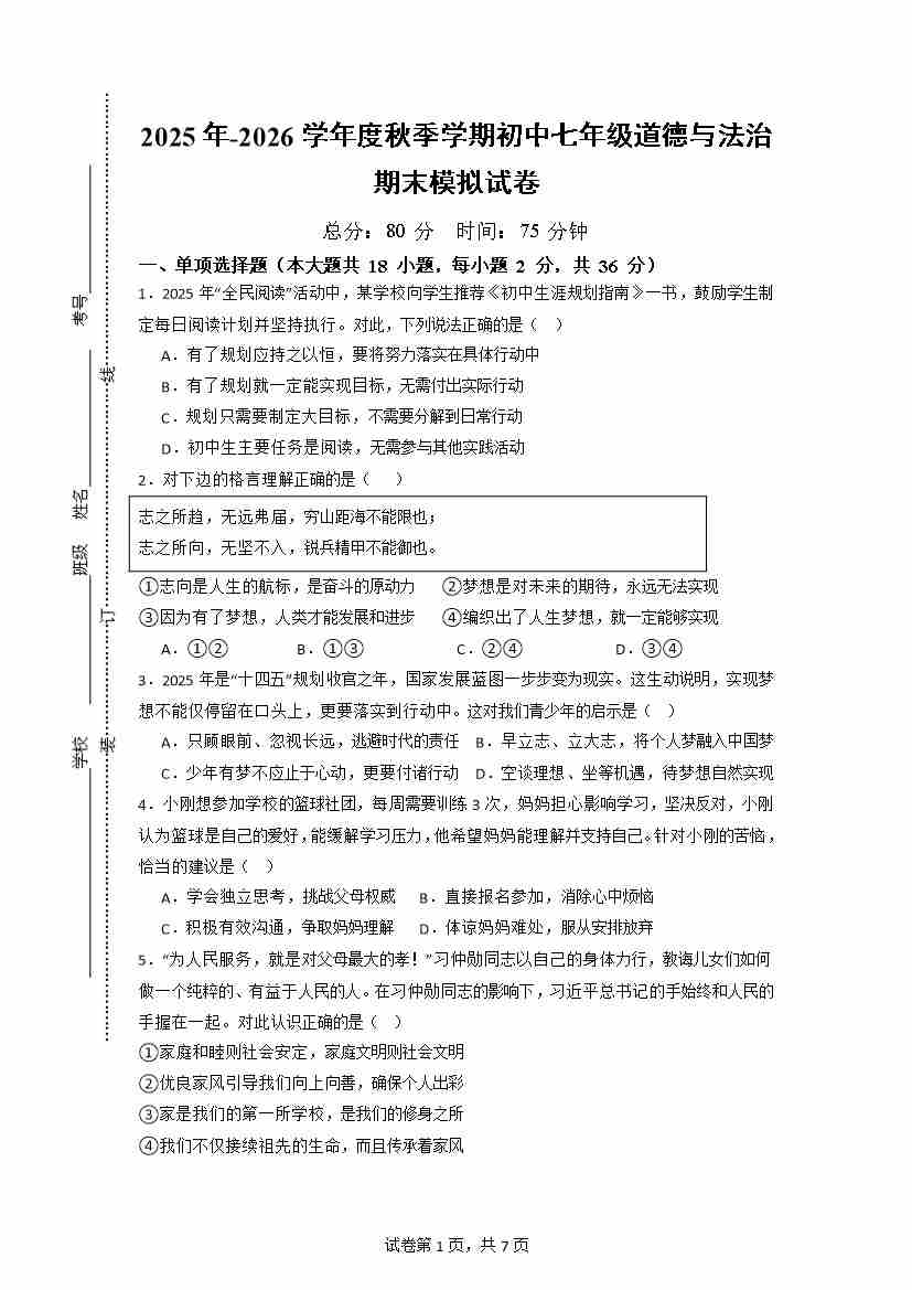 期末复习试卷-2025-2026学年统编版道德与法治七年级上册(1)