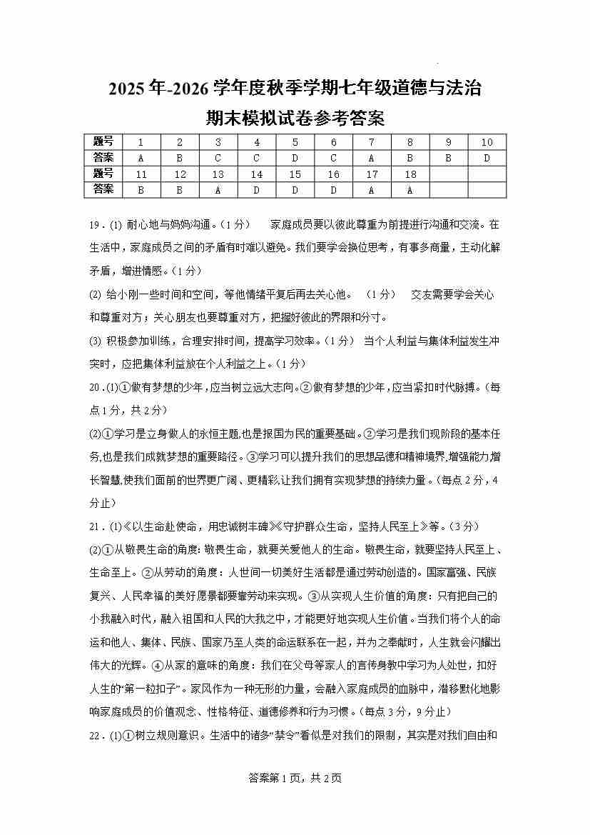 参考答案2025-2026学年度七年级道德与法治期末模拟试卷