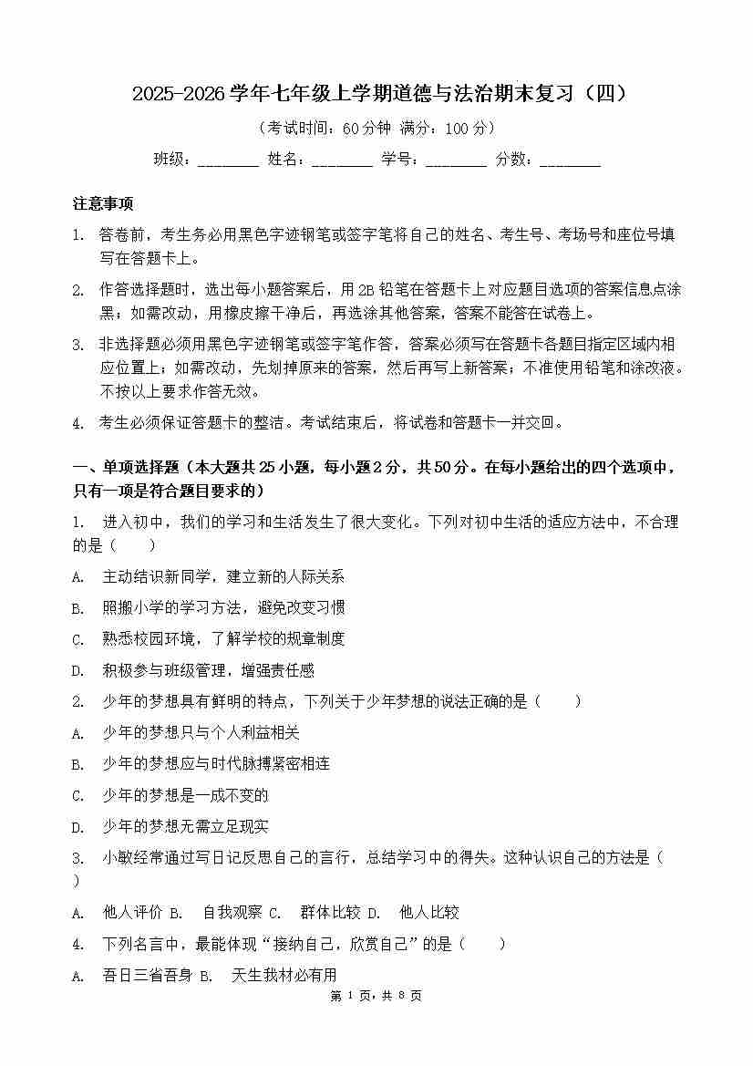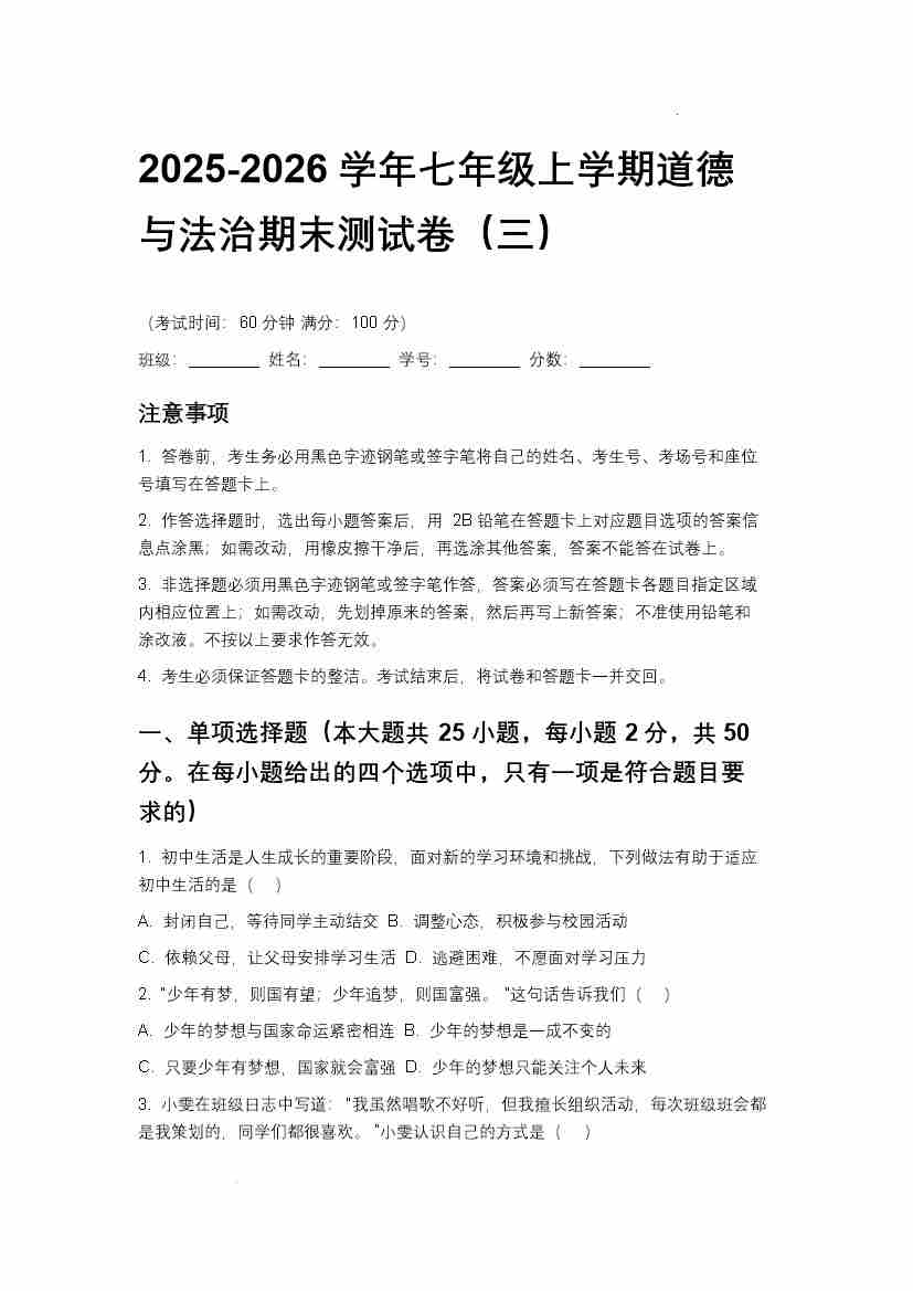 期末复习试卷-2025-2026学年统编版道德与法治七年级上册