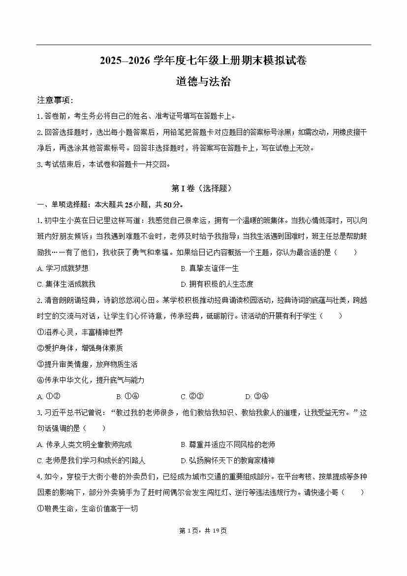 期末模拟考试题-2025-2026学年统编版道德与法治七年级上册