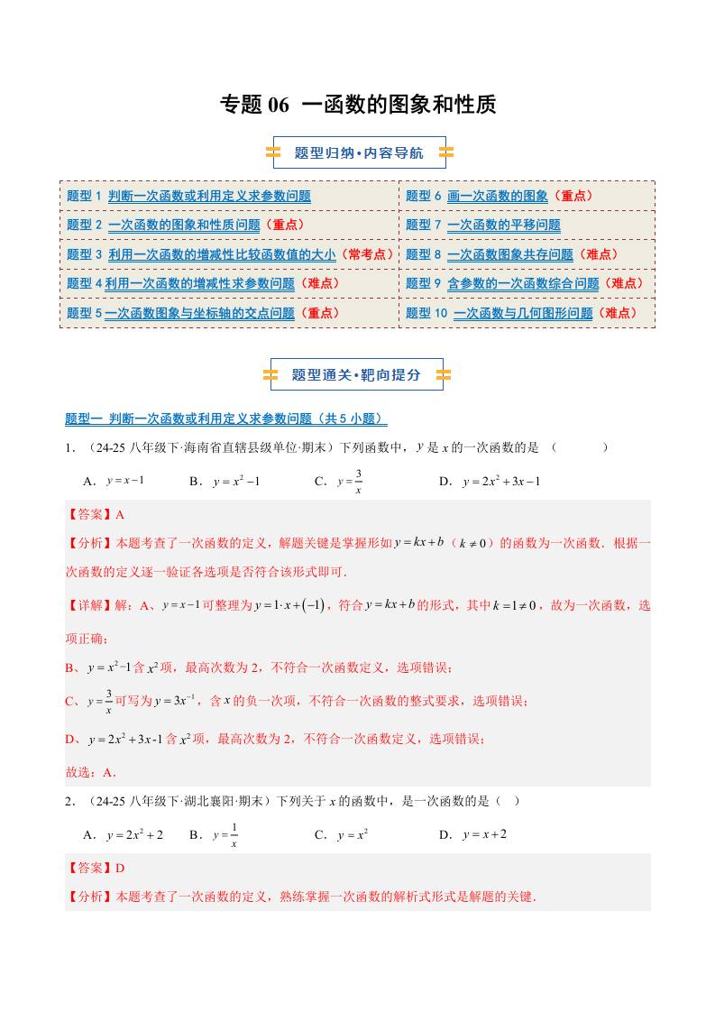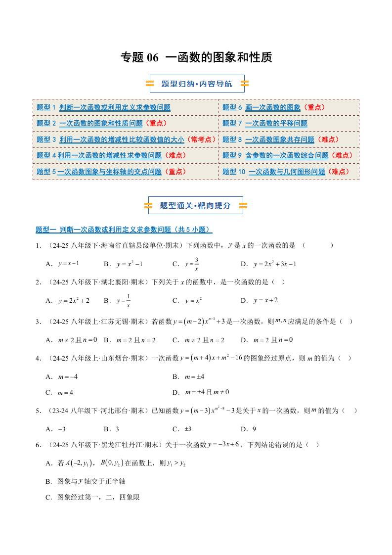 专题06 一函数的图象和性质(10大题型)(期末复习专项训练)(原卷版)