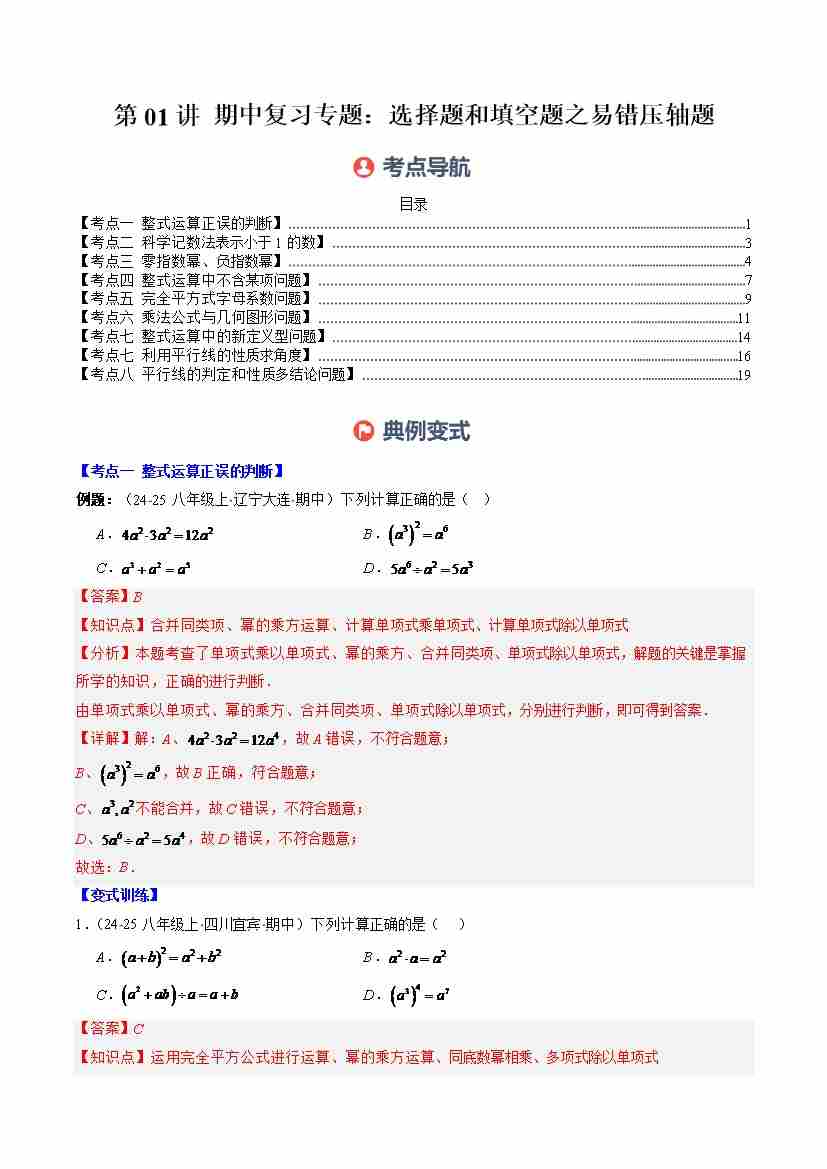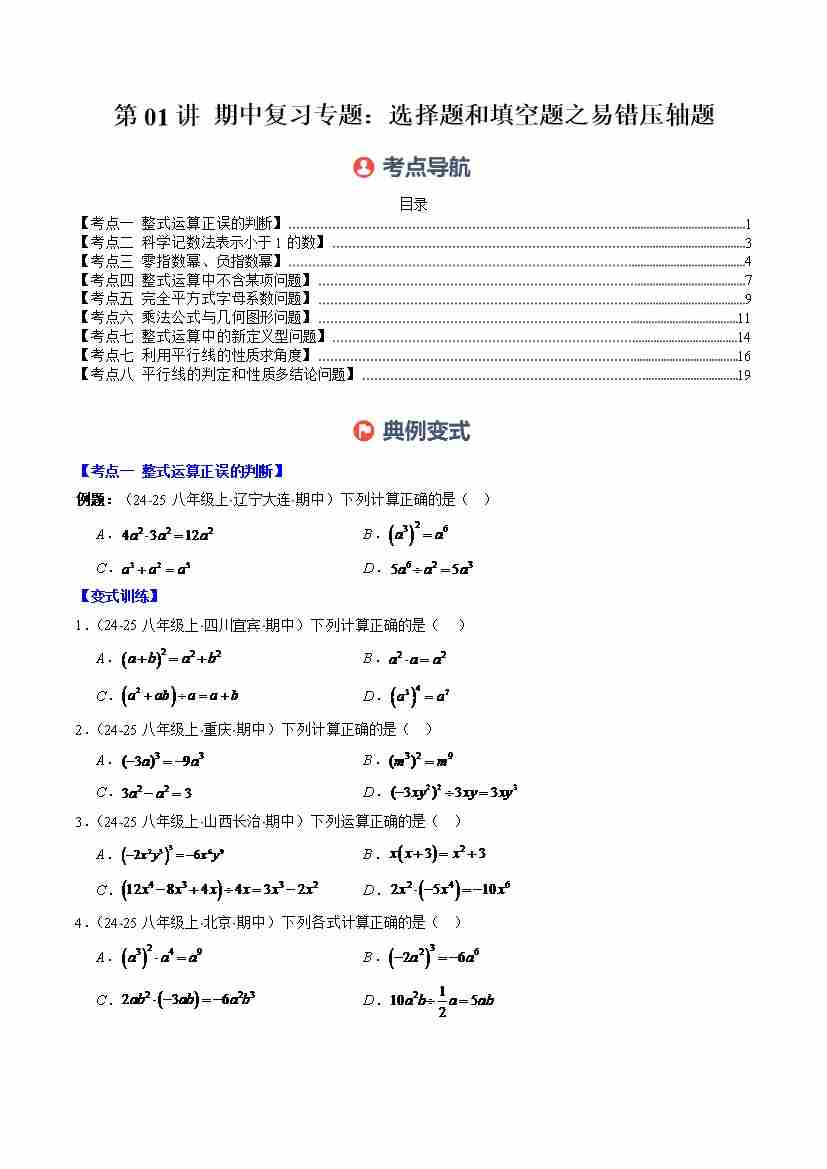 第01讲 期中复习专题:选择题和填空题易错压轴题(8大常考题型)(学生版)