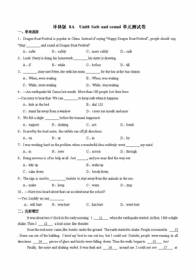 译林版八年级上学期 Unit8 Safe and sound单元卷(原卷版)