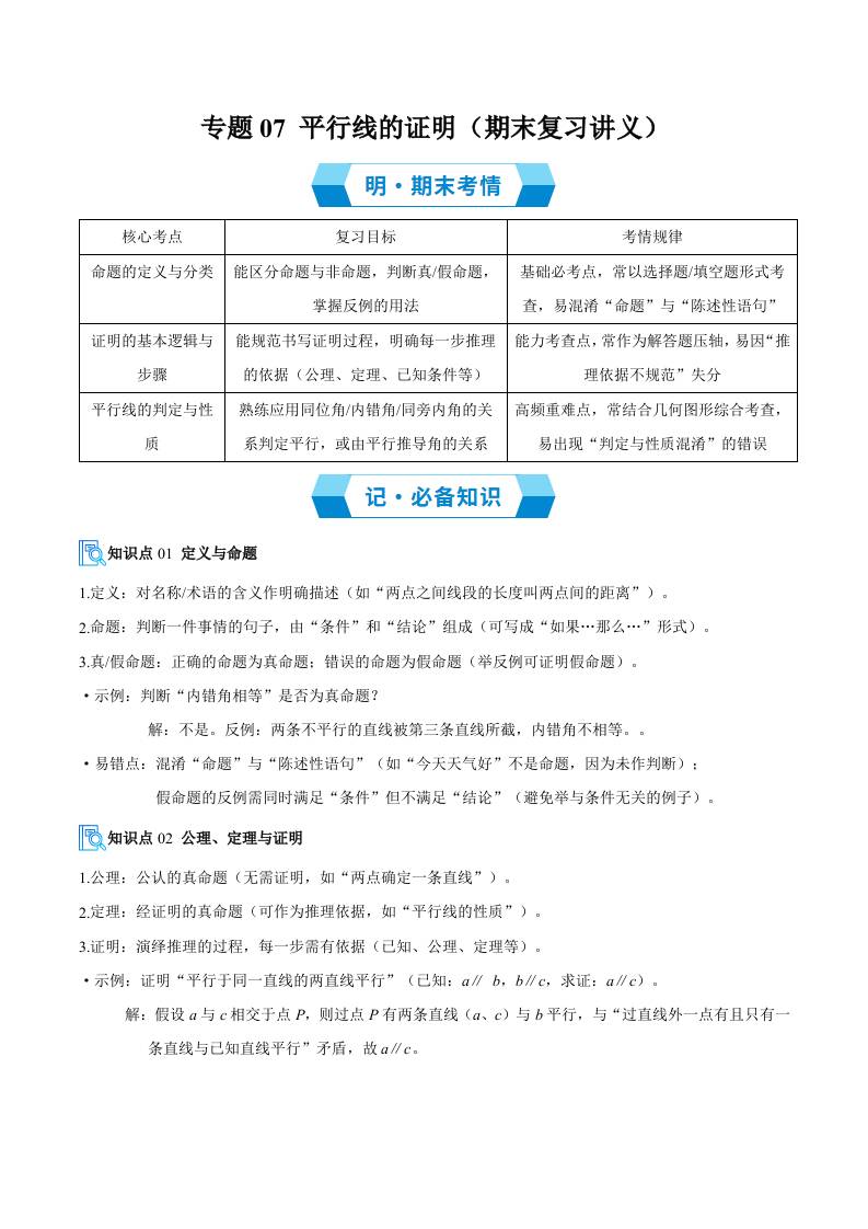 专题07 平行线的证明(必备知识9大题型分层训练)(期末复习讲义)(原卷版)