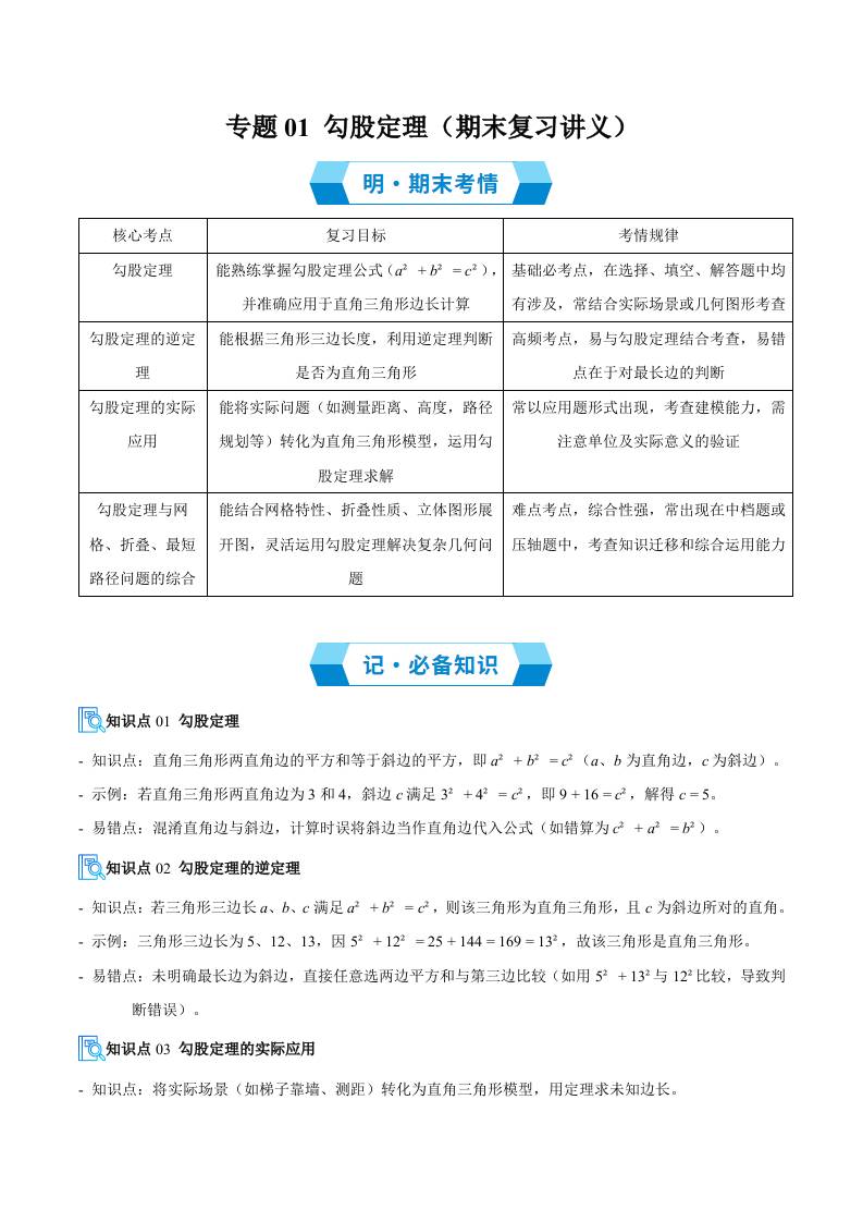 专题01 勾股定理(必备知识8大题型分层训练)(期末复习讲义)(学生版)