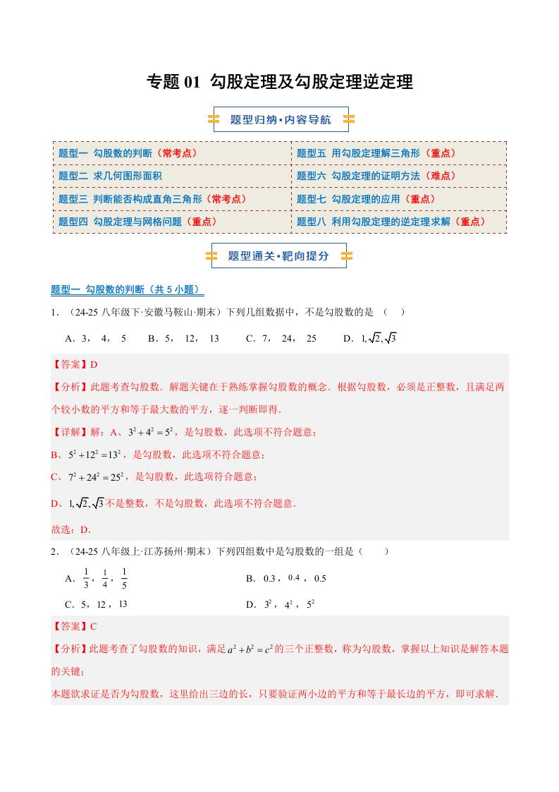 专题01 勾股定理及勾股定理逆定理(8大题型)(期末复习专项训练)(解析版)