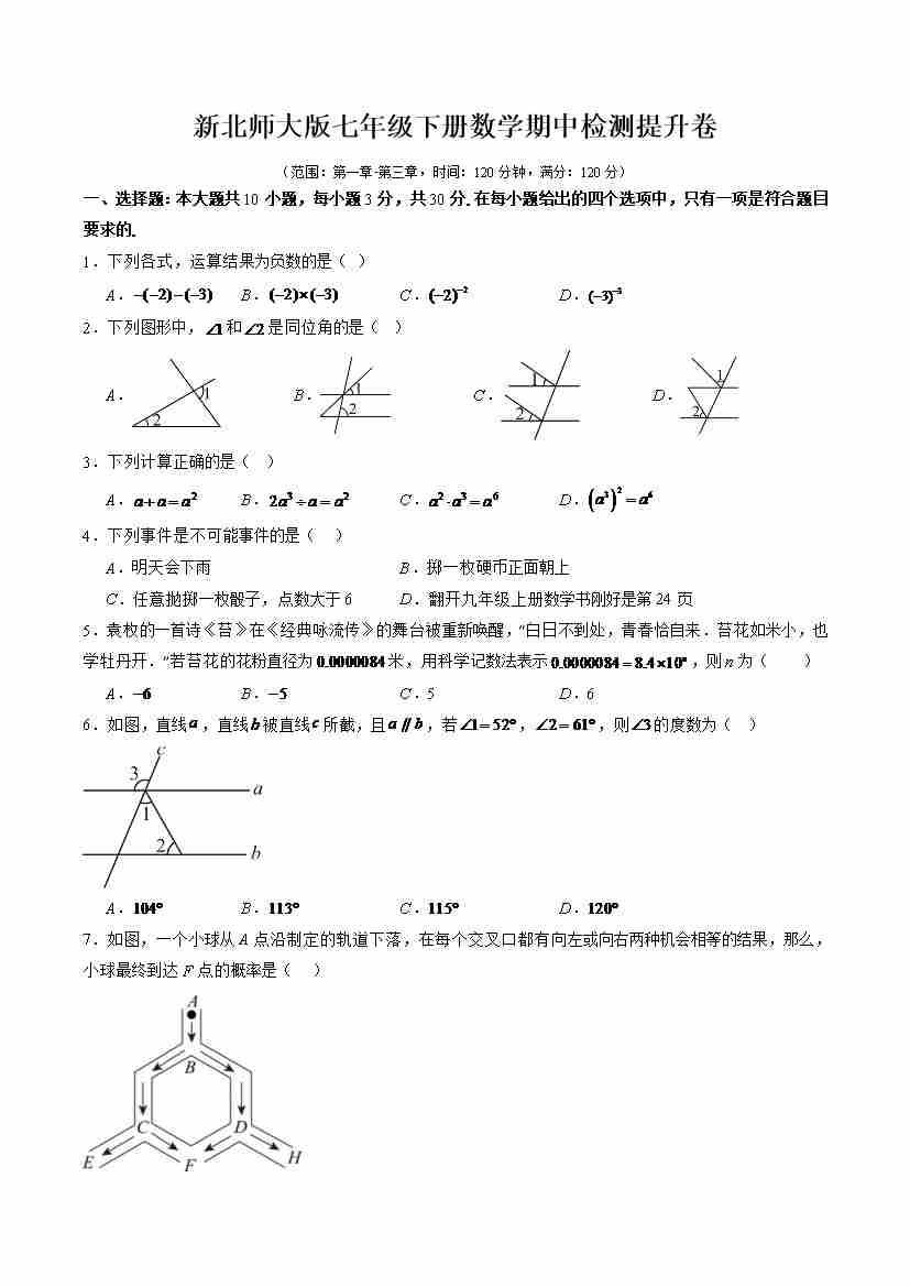 新北师大版七年级下册数学期中检测提升卷(范围:第一章-第三章)(学生版)