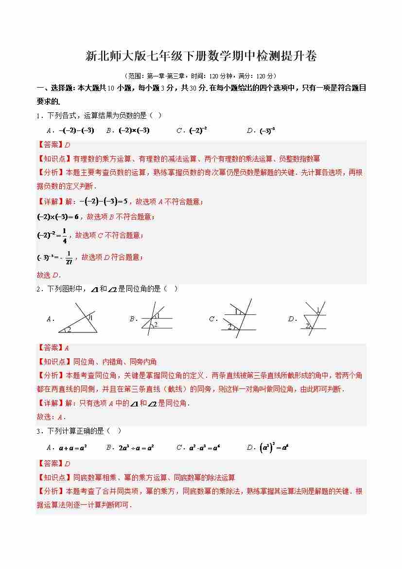 新北师大版七年级下册数学期中检测提升卷(范围:第一章-第三章)(教师版)