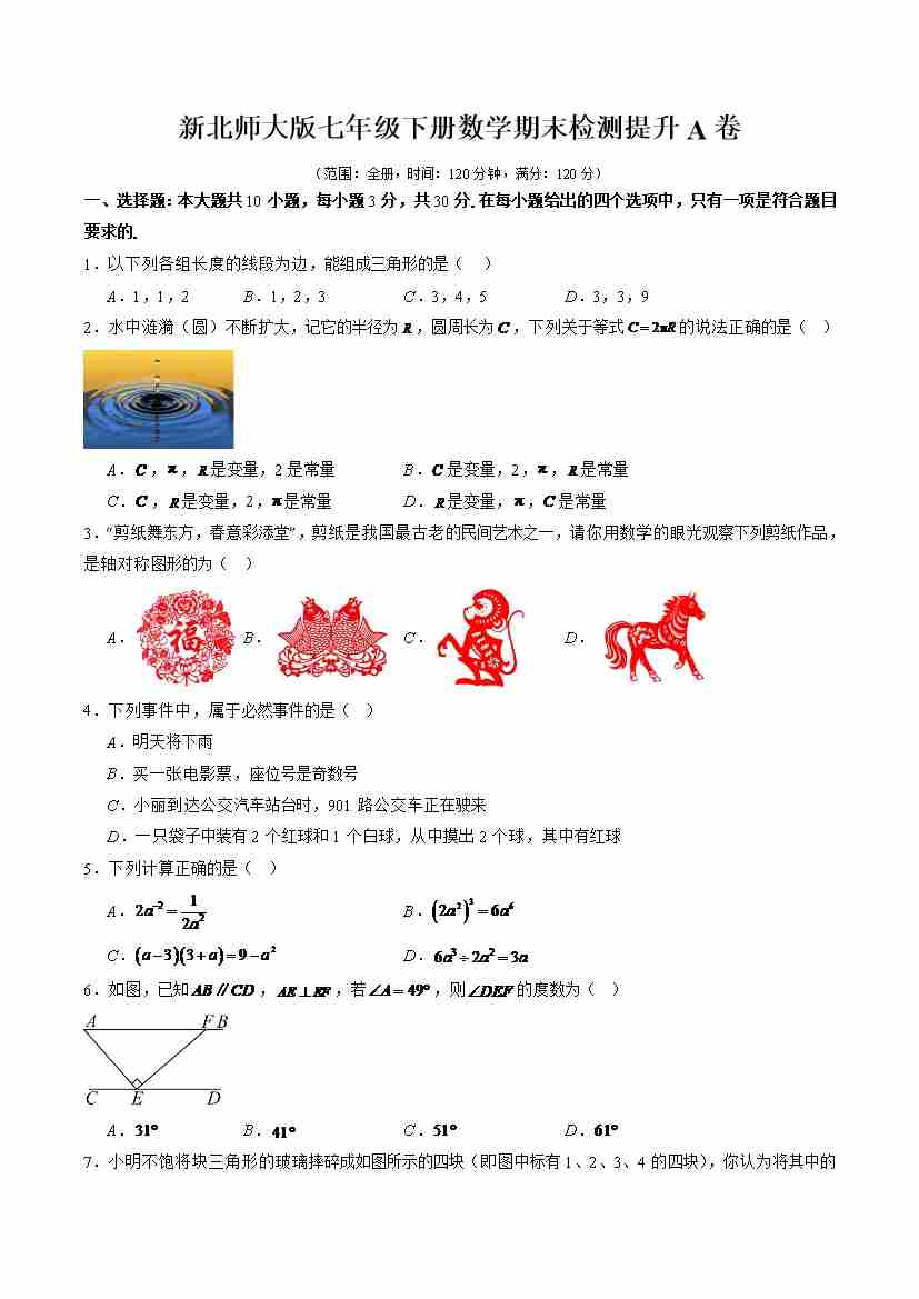 新北师大版七年级下册数学期末检测提升A卷(范围:七下全册)(学生版)