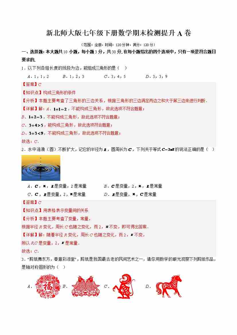新北师大版七年级下册数学期末检测提升A卷(范围:七下全册)(教师版)