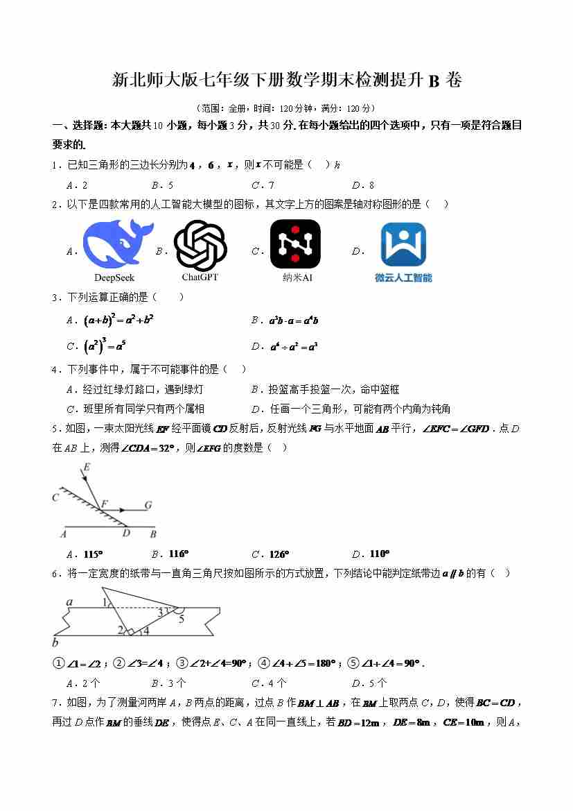 新北师大版七年级下册数学期末检测提升B卷(范围:七下全册)(学生版)