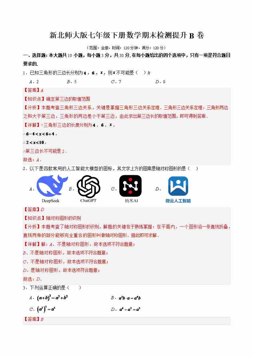 新北师大版七年级下册数学期末检测提升B卷(范围:七下全册)(教师版)