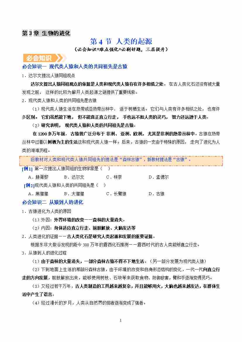 6.3.4 人类的起源(提升讲义)生物新教材人教版八年级下册(原卷版)