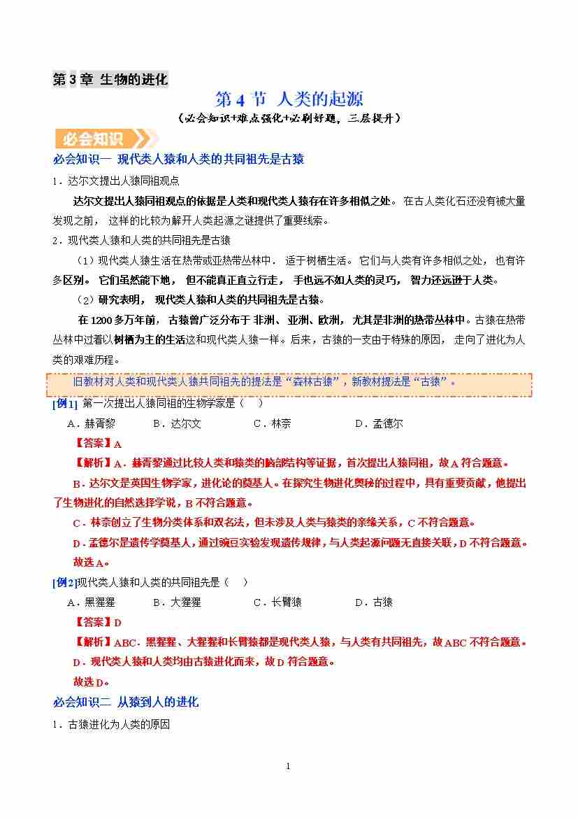 6.3.4 人类的起源(提升讲义)生物新教材人教版八年级下册(解析版)