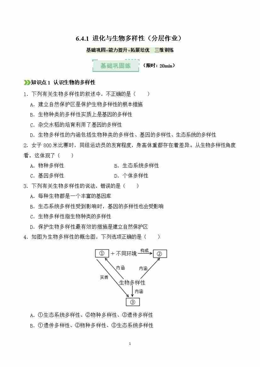 6.4.1 进化与生物多样性(分层作业)(原卷版)