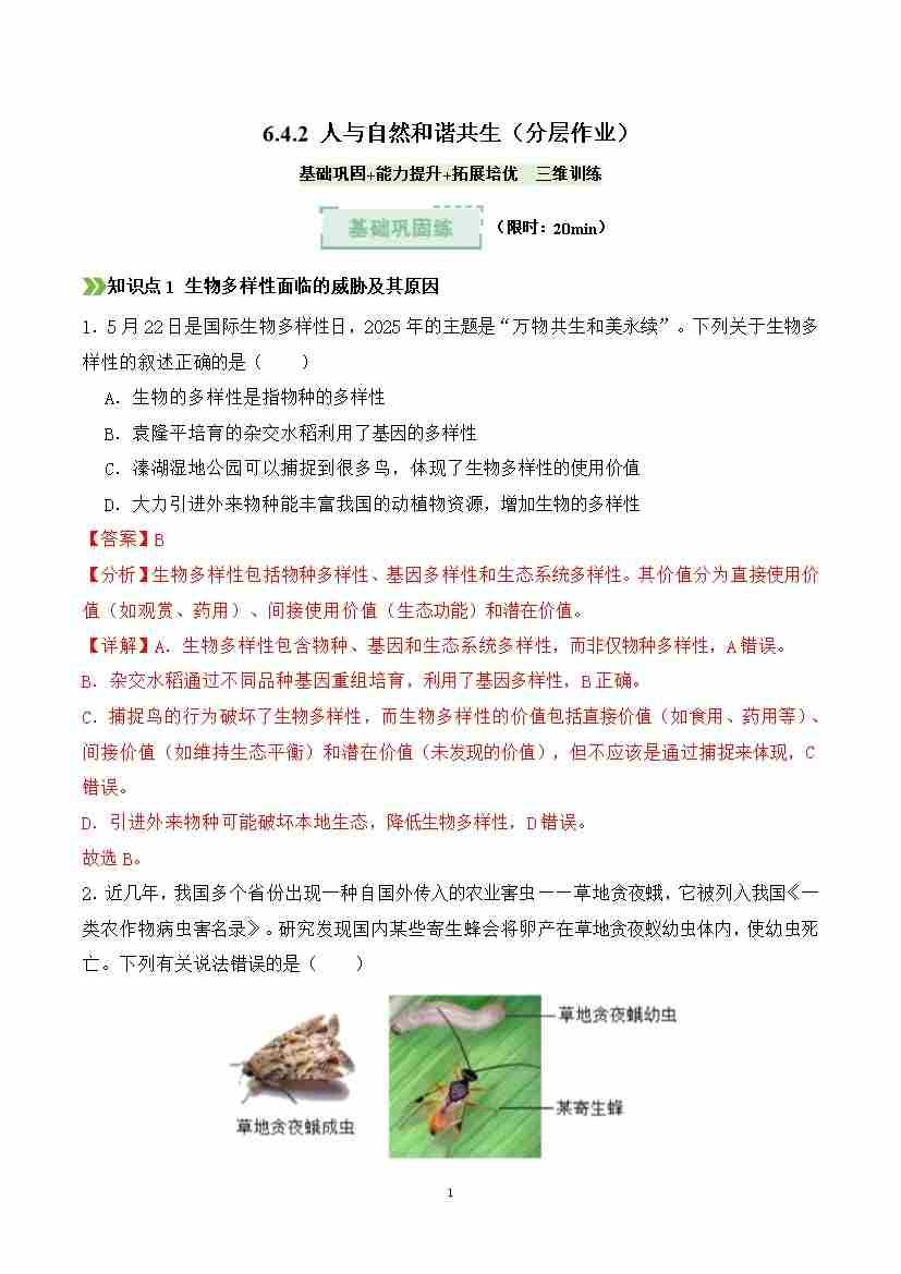 6.4.2 人与自然和谐共生 (分层作业)(解析版)