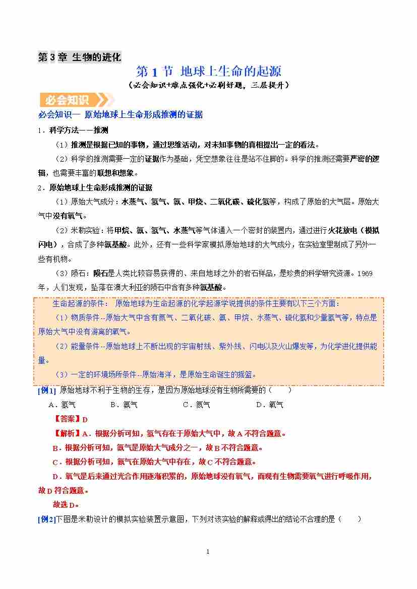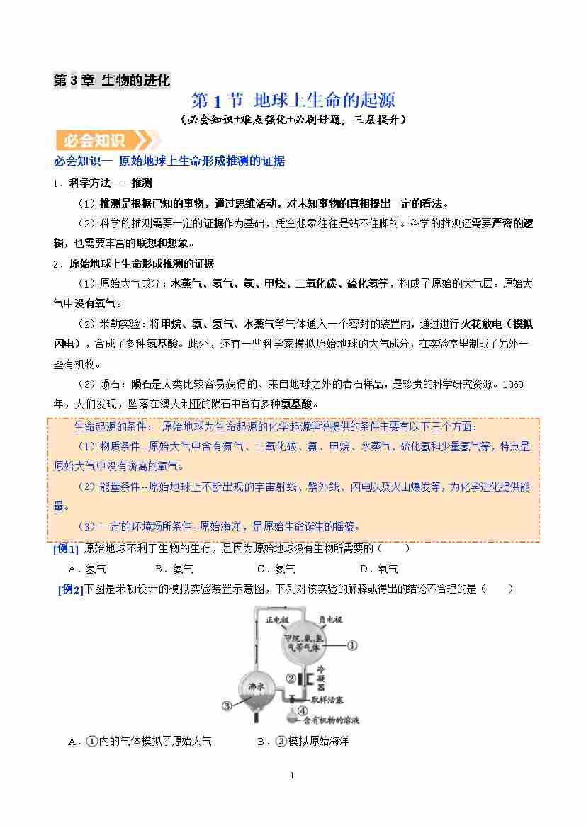 6.3.1 地球上生命的起源(提升讲义)生物新教材人教版八年级下册(解析版)