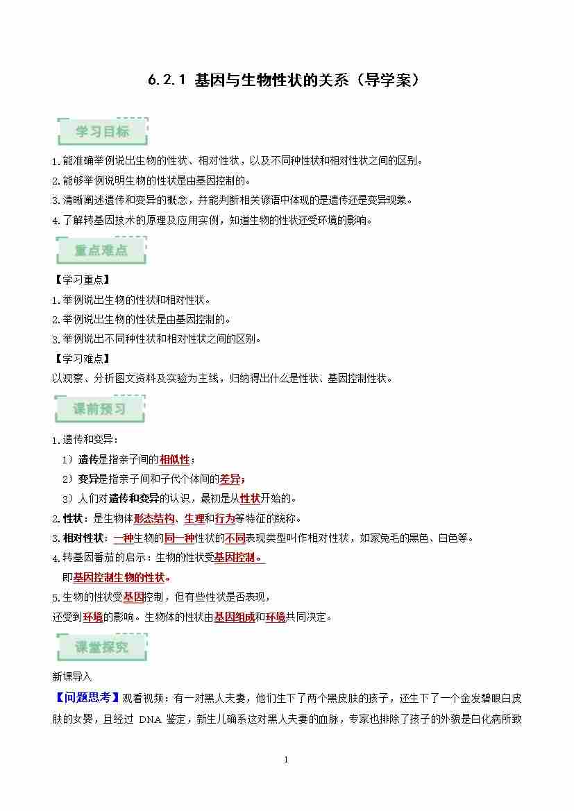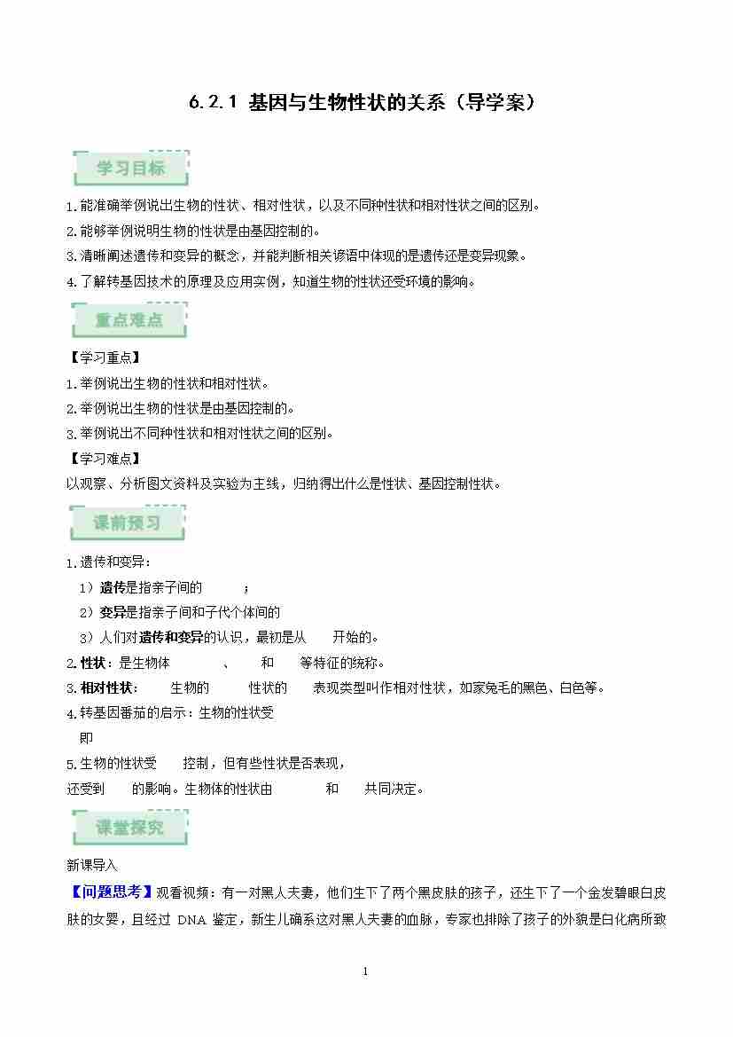 6.2.1 基因与生物性状的关系(原卷版)(导学案)生物人教版2024八年级上册