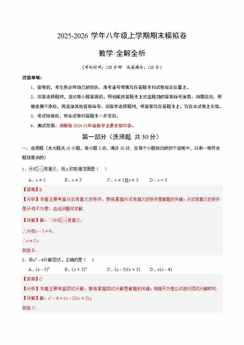 八年级数学上学期期末模拟卷01(新教材湘教版)(全解全析)