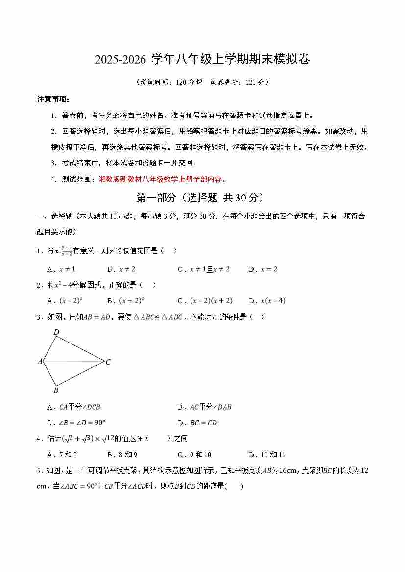 八年级数学上学期期末模拟卷01(新教材湘教版)(考试版A4)