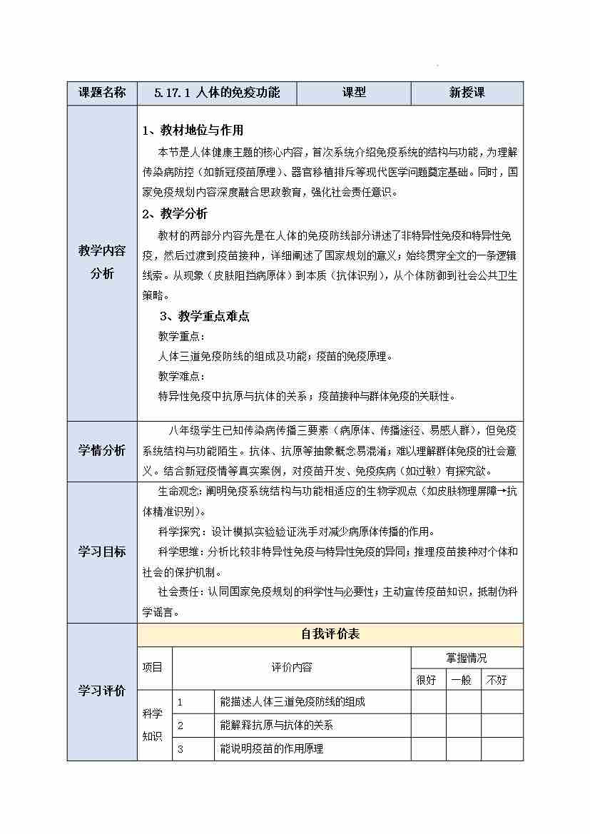 5.17.1 人体的免疫功能 教学设计-2025-2026学年苏教版生物八年级下册