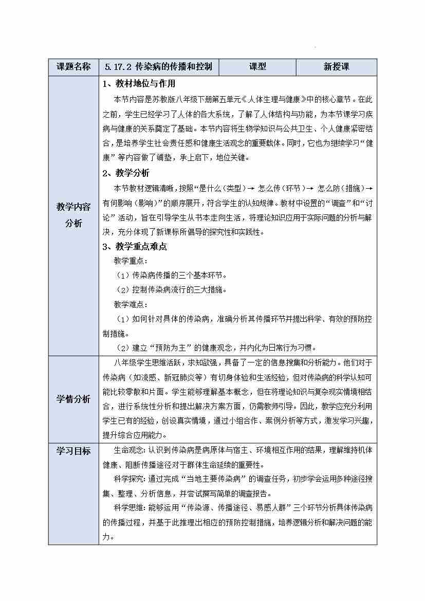 5.17.2 传染病的传播和控制 教学设计-2025-2026学年苏教版生物八年级下册