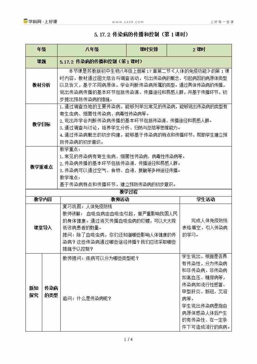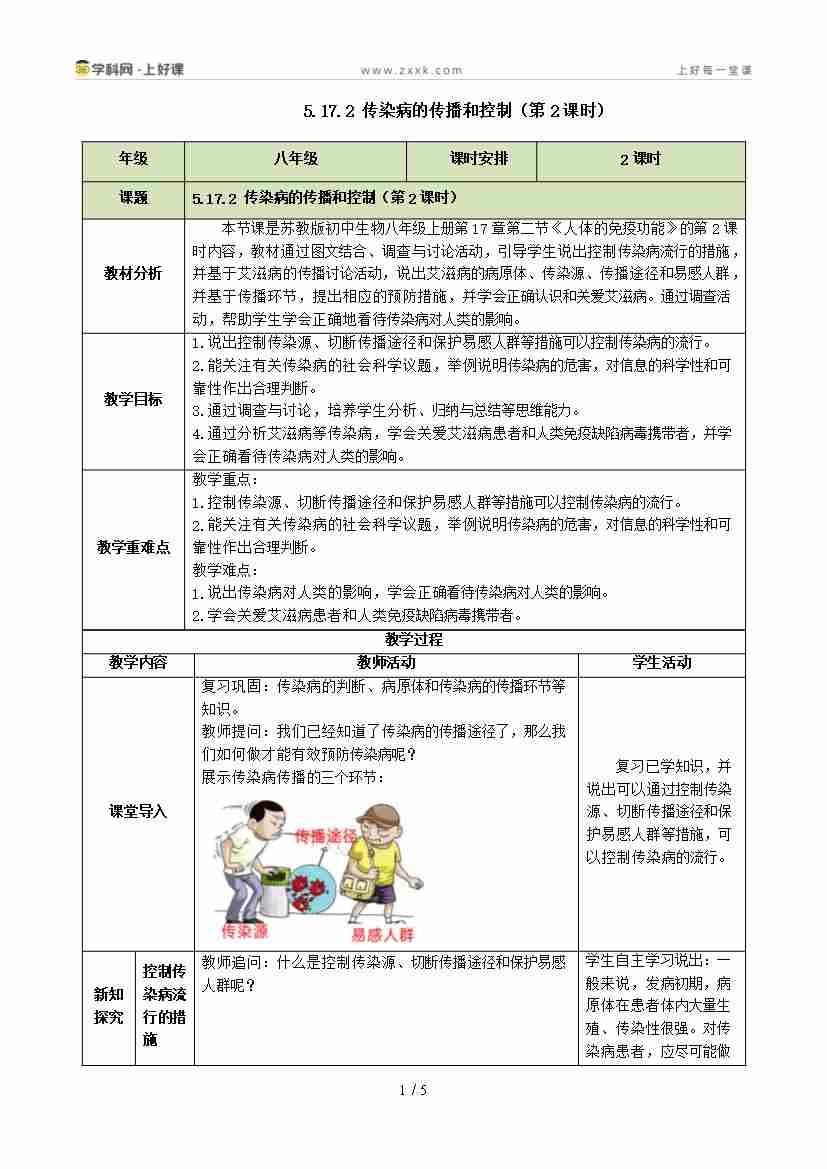 5.17.2 传染病的传播和控制 第1课时(教学设计)生物新教材苏教版八年级下册