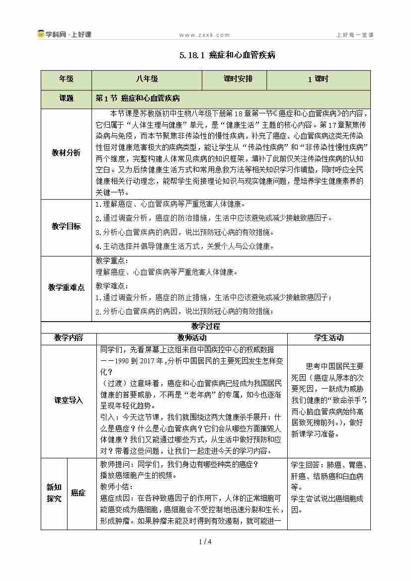 5.18.1 癌症和心血管疾病(教学设计)生物新教材苏教版八年级下册