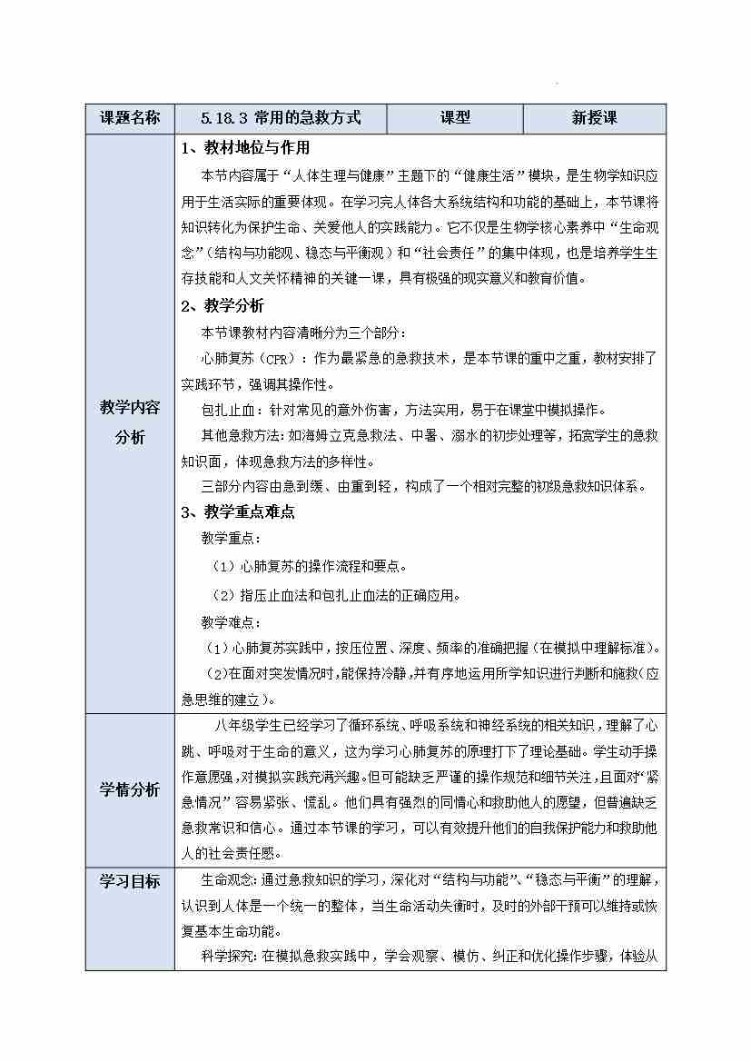 5.18.3 常用的急救方式 教学设计-2025-2026学年苏教版生物八年级下册