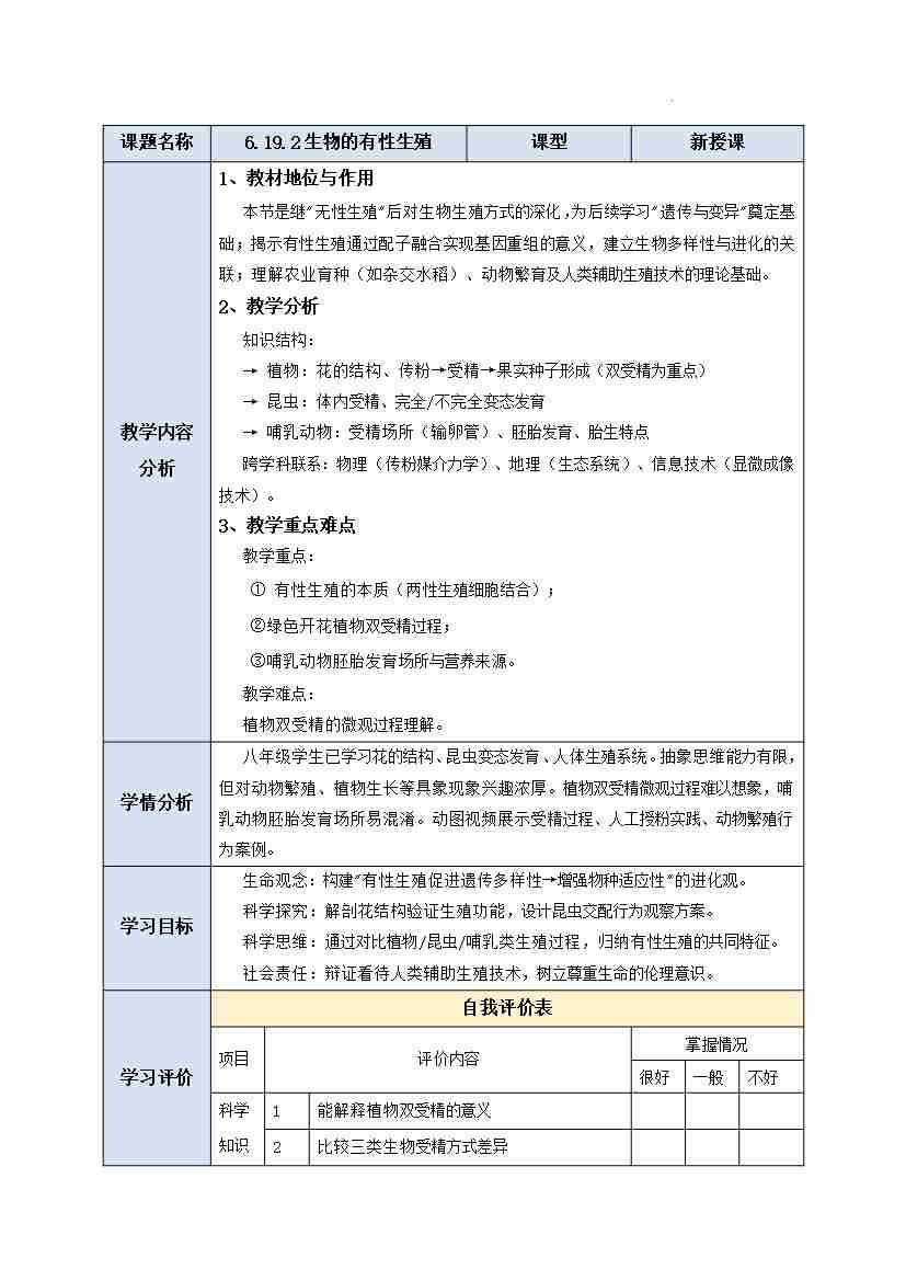 6.19.2 生物的有性生殖 教学设计-2025-2026学年苏教版生物八年级下册