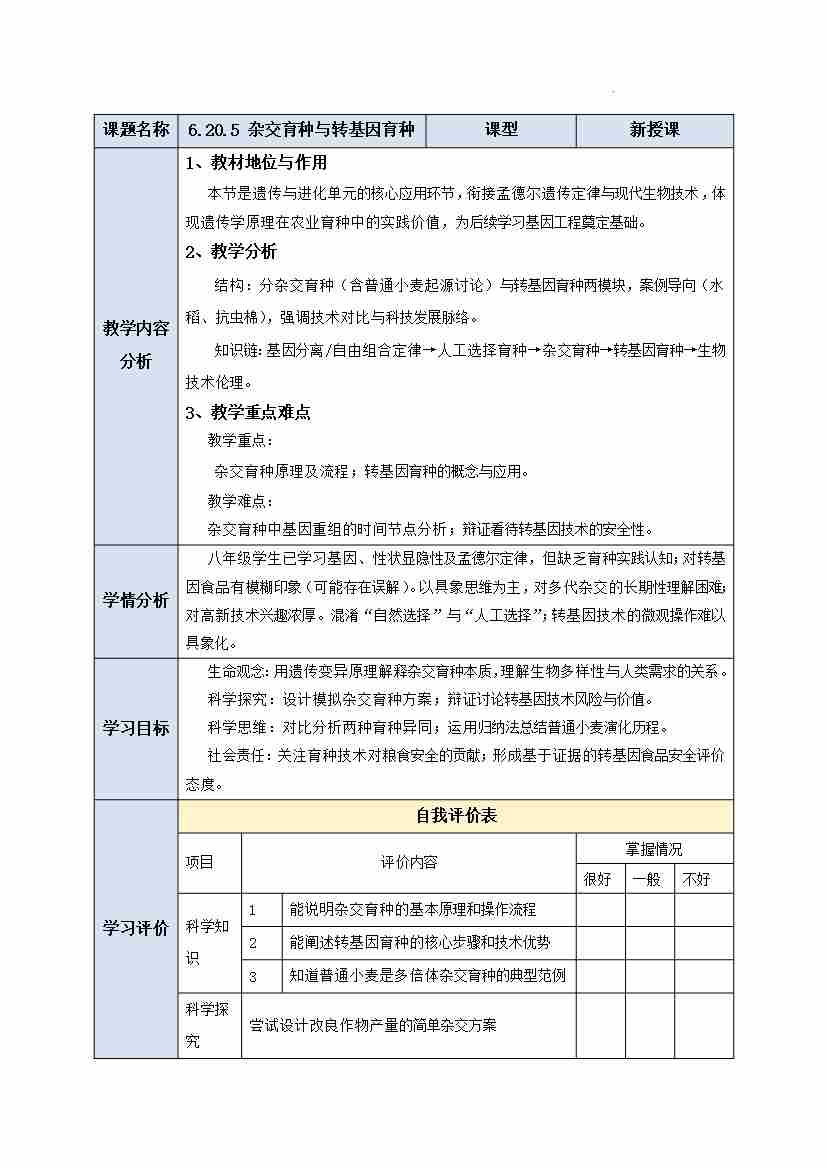 6.20.5 杂交育种与转基因育种 教学设计-2025-2026学年苏教版生物八年级下册