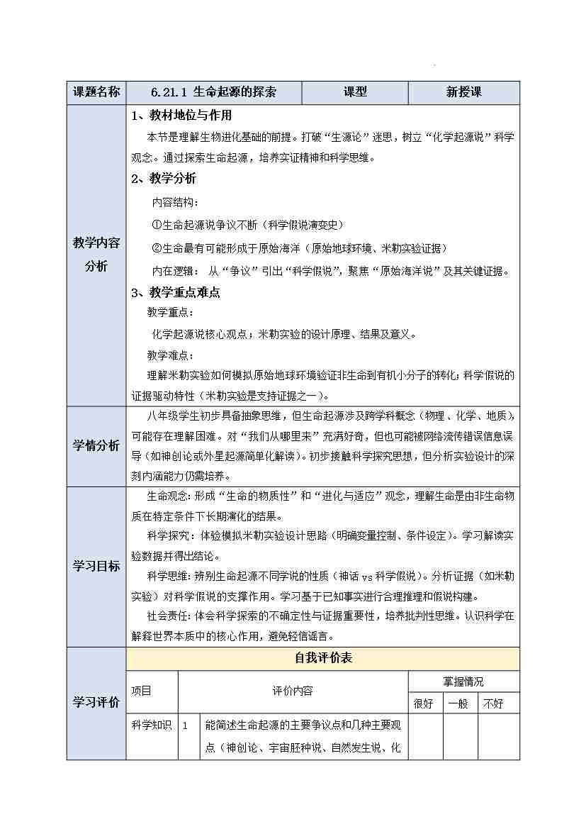 6.21.1 生命起源的探索 教学设计-2025-2026学年苏教版生物八年级下册