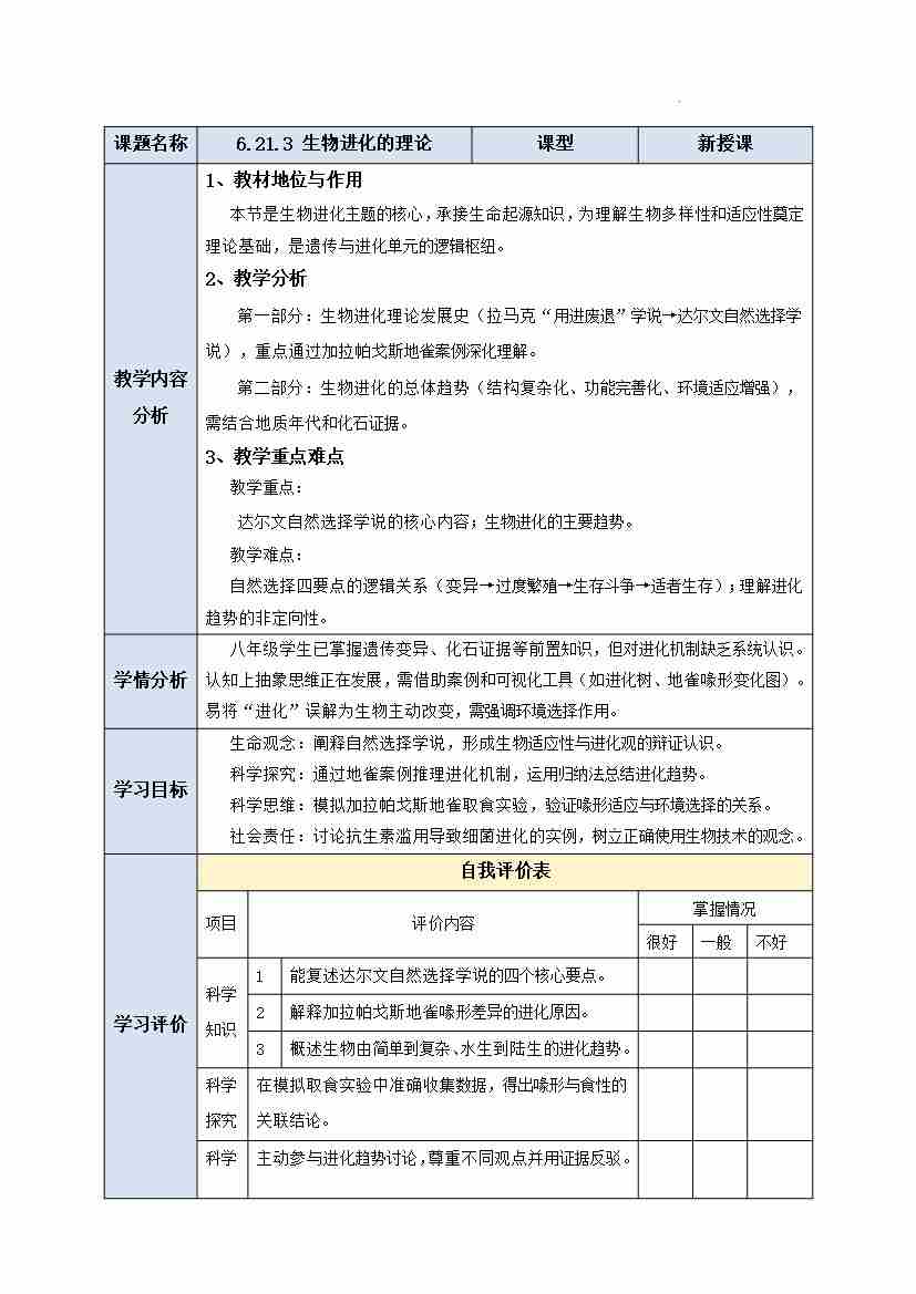 6.21.3 生物进化的理论教学设计 -2025--2026学年苏教版生物八年级下册