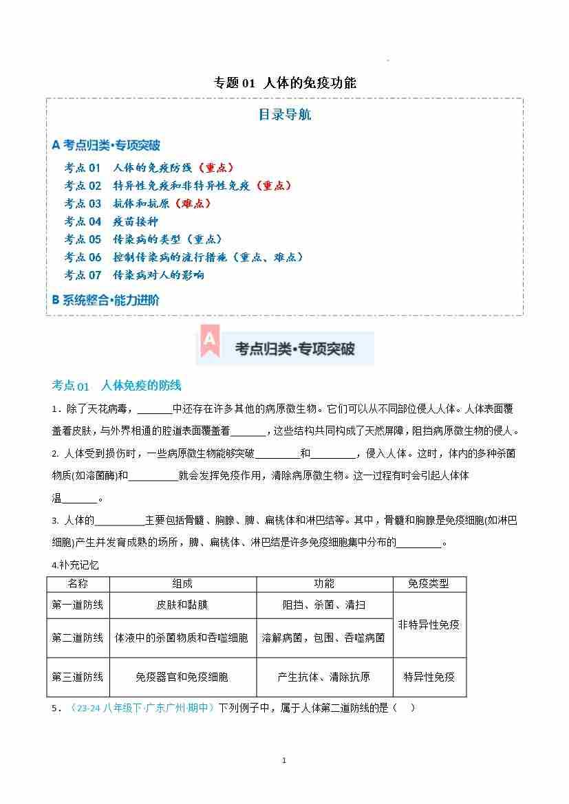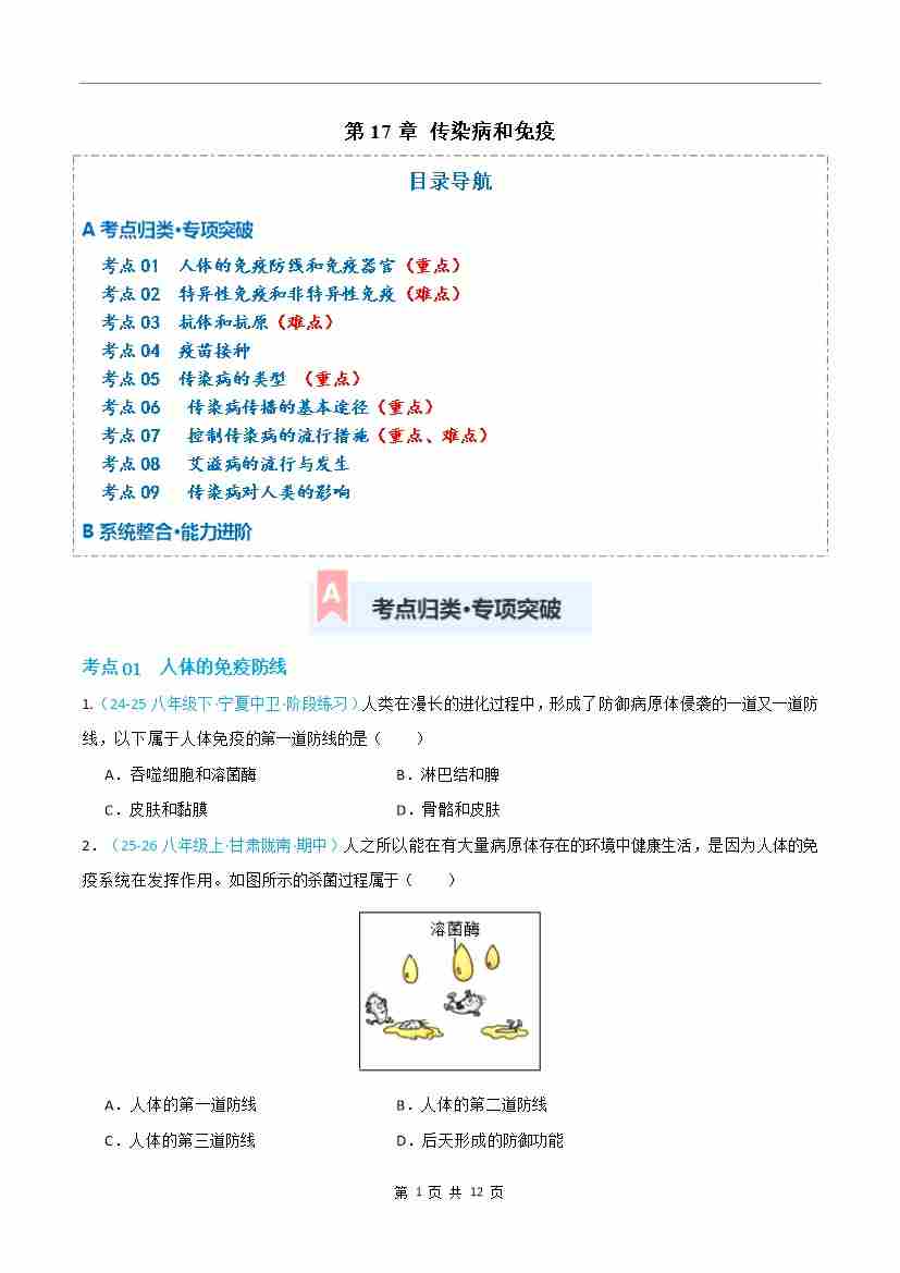第17章 传染病和免疫(专项训练)(原卷板)