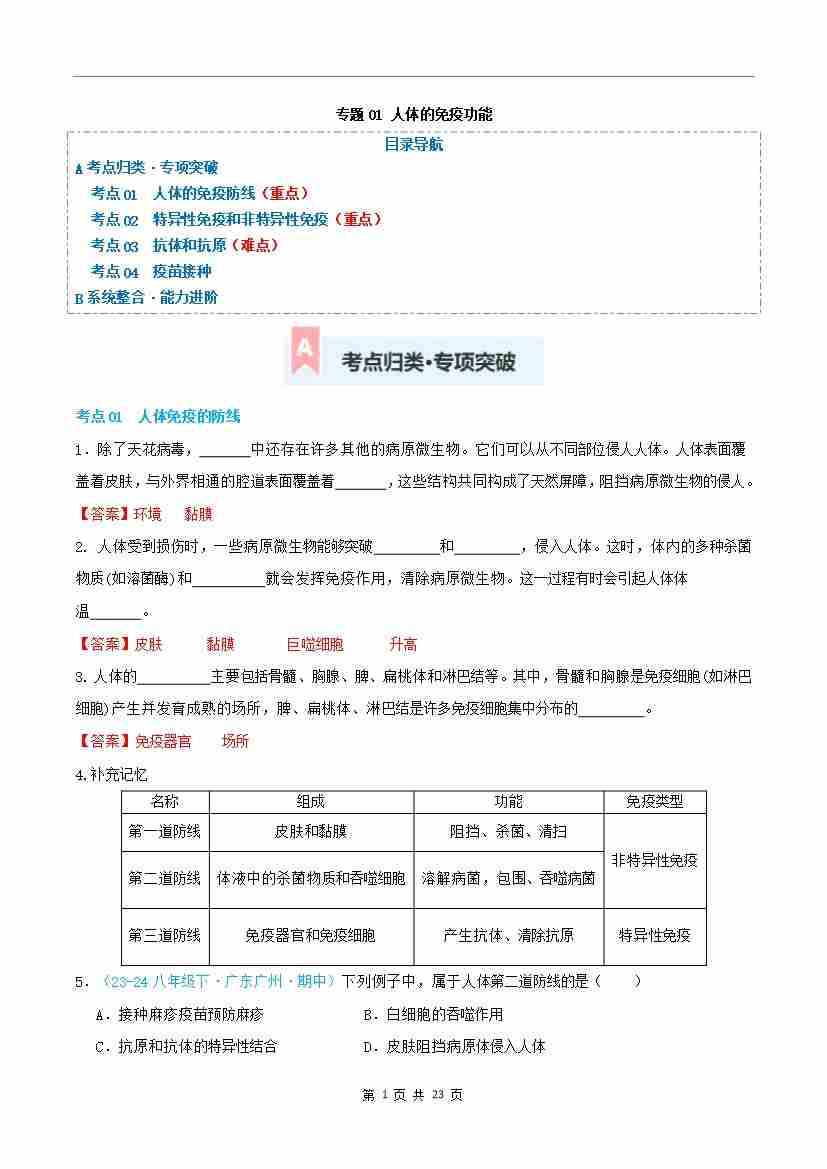 人体的免疫功能(专项训练)(原卷版)