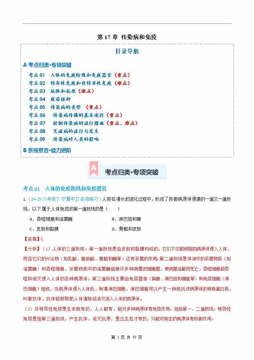 第17章 传染病和免疫(知识清单)(解析版)
