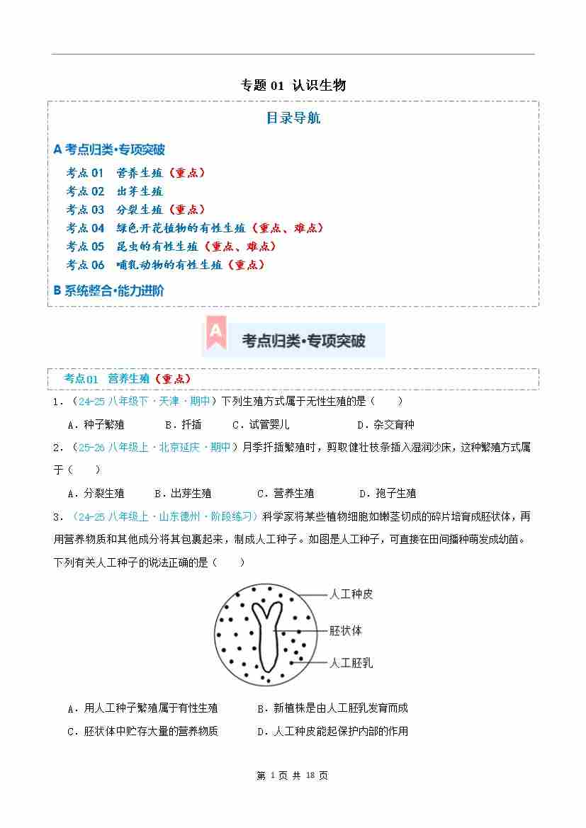 第18章 生物的生殖(专项训练)(原卷版)