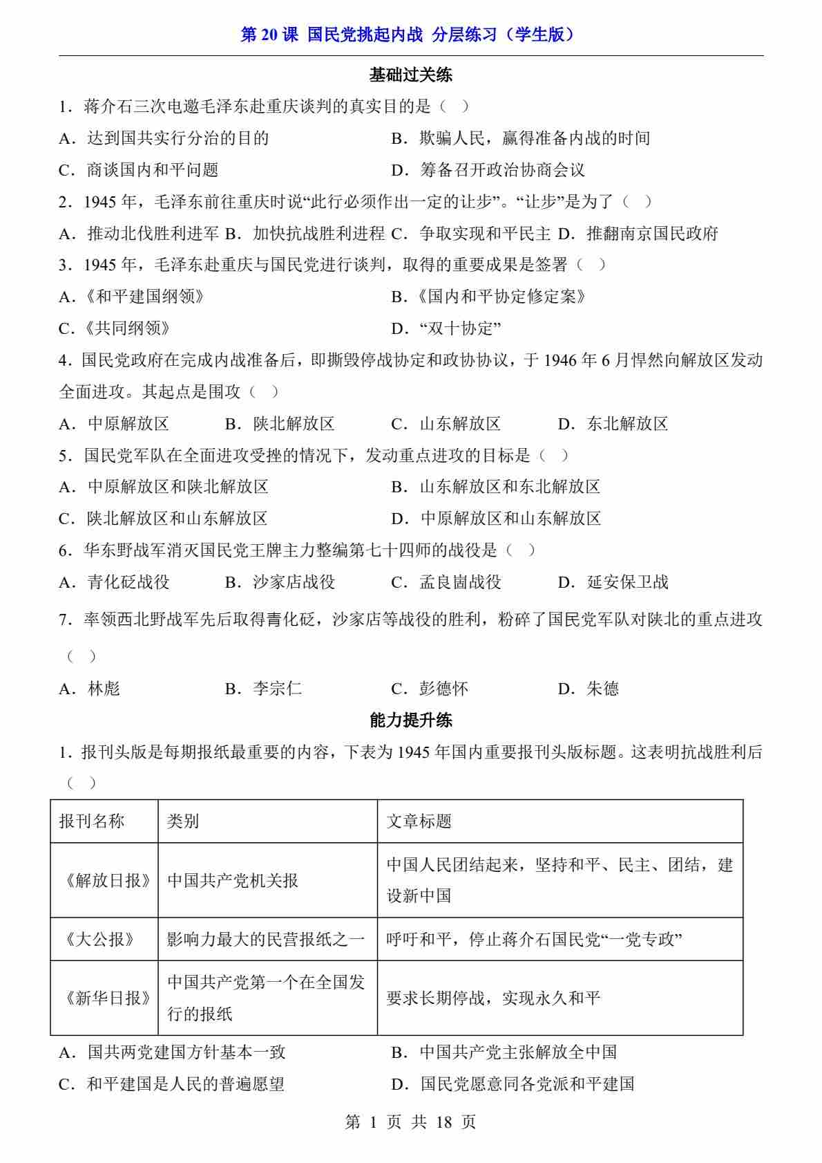 第20课 国民党挑起内战(分层练习)