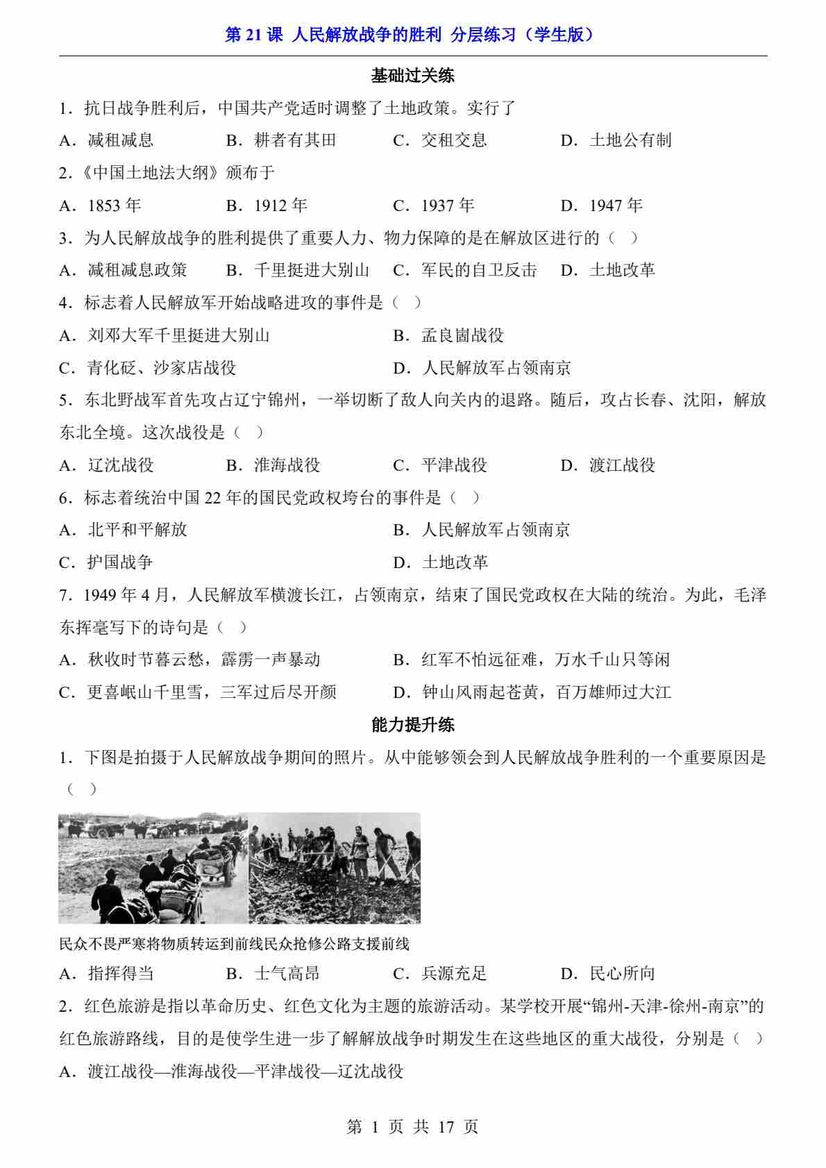第21课 人民解放战争的胜利(分层练习)