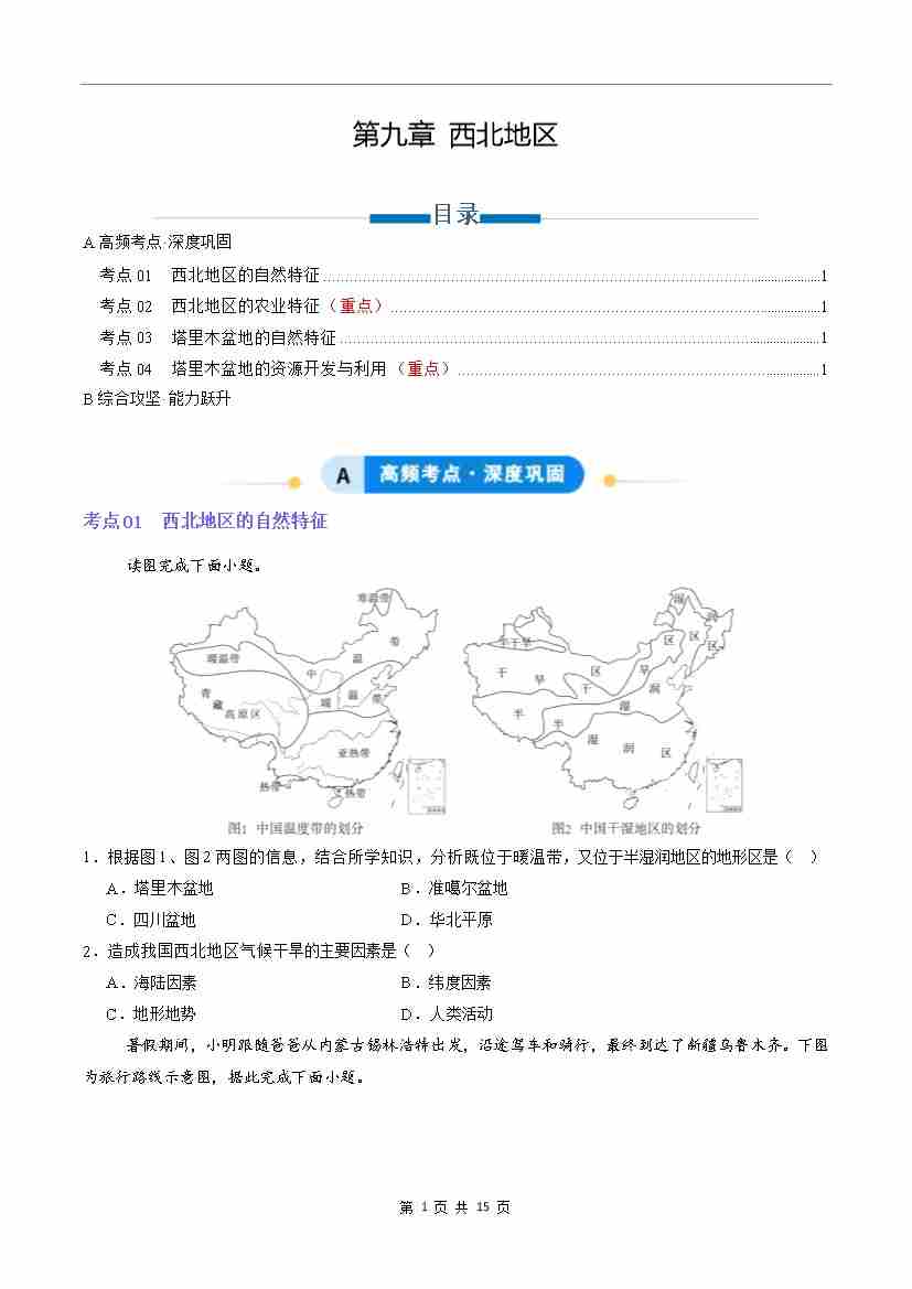 第九章 西北地区(专项训练)(原卷版)