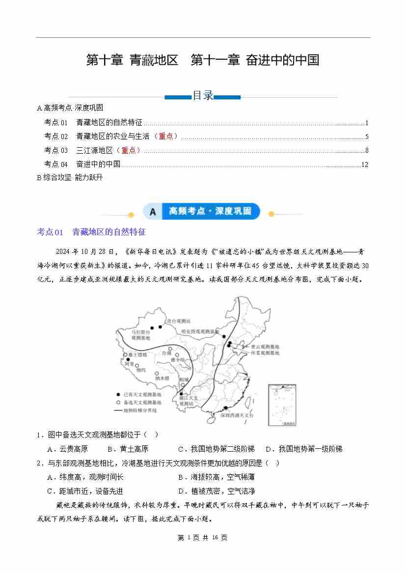 第十章 青藏地区、第十一章 奋进中的中国(专项训练)(原卷版)