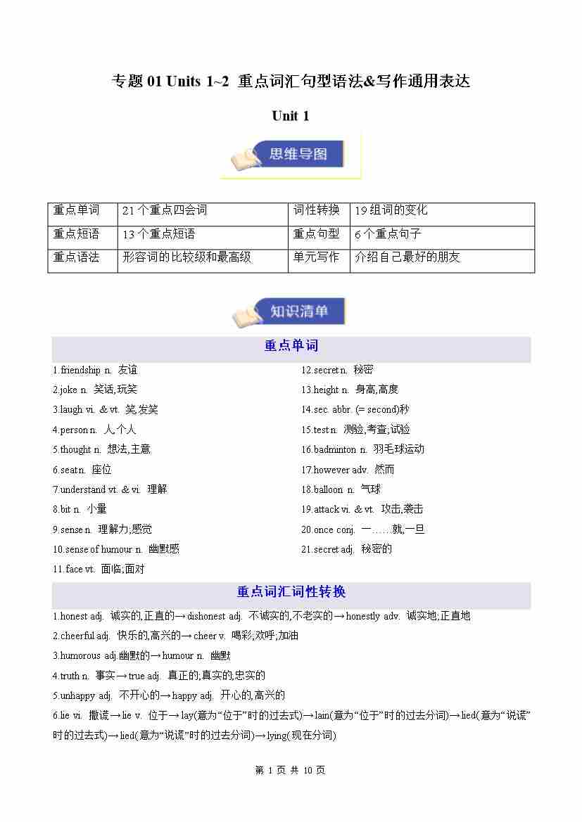 专题01 Units 1~2 重点词汇句型语法&写作通用表达(期末复习知识清单)(背诵版)