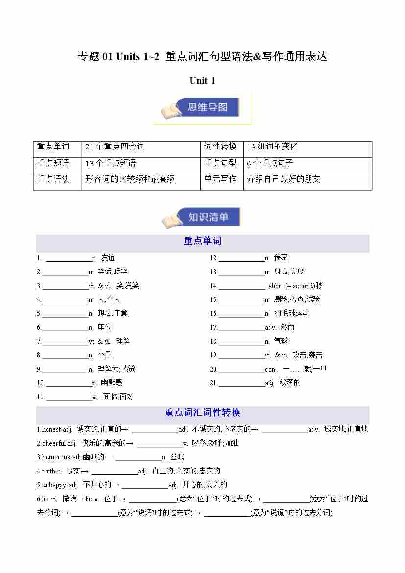 专题01 Units 1~2 重点词汇句型语法&写作通用表达(期末复习知识清单)(默写版)